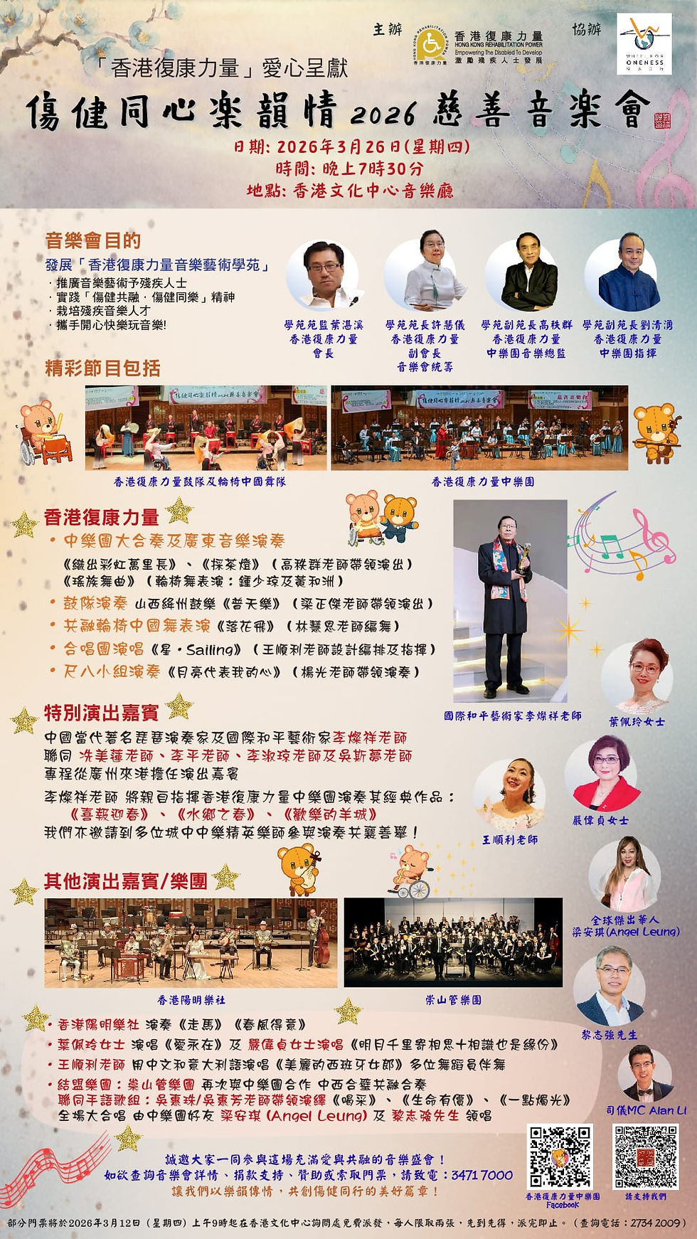 香港復康力量中樂團、合唱團、鼓隊、輪椅中國舞隊、尺八隊均會演出。